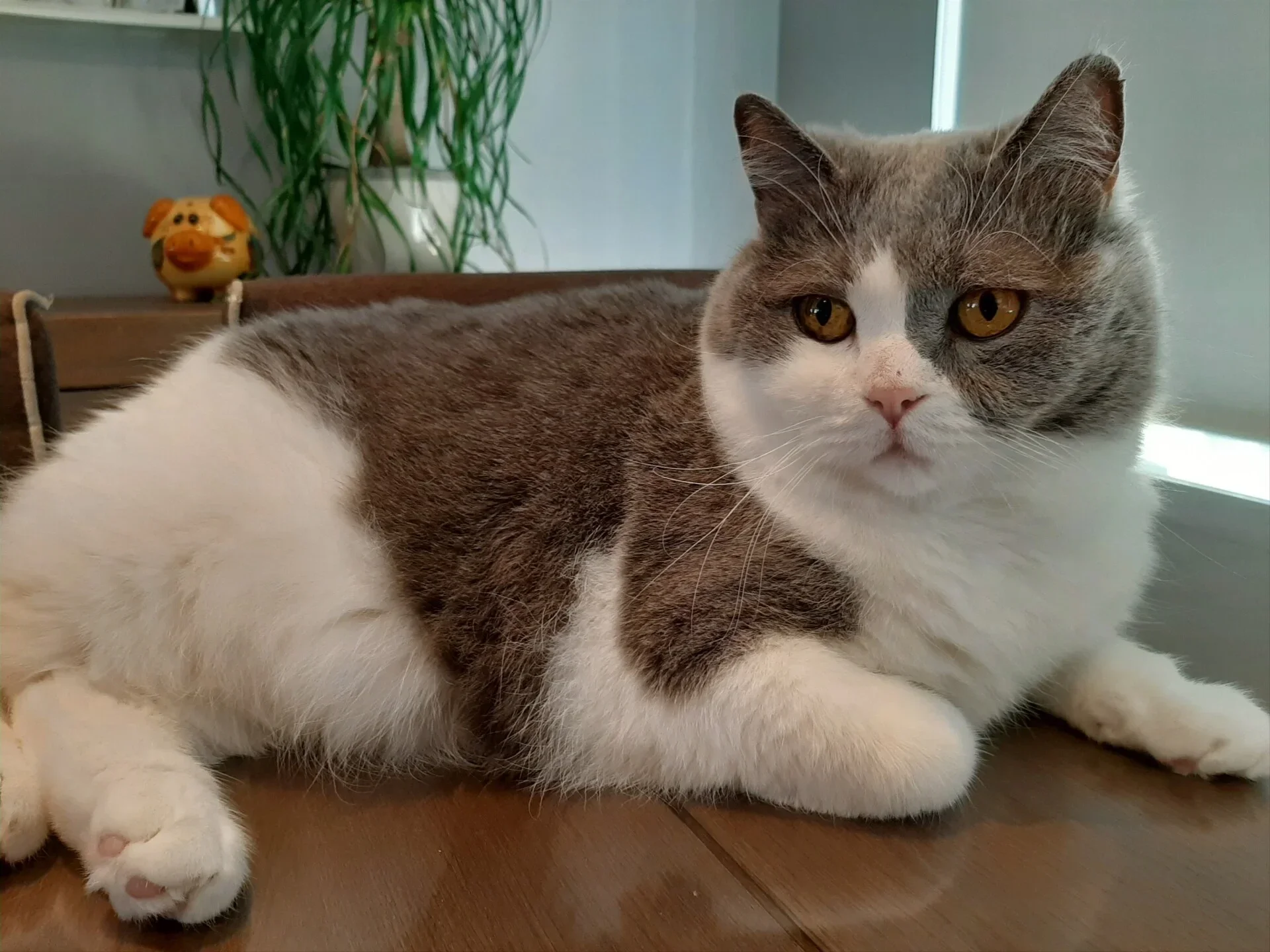 Eerst iets over het ras de Brits korthaar. Er wordt aangenomen dat de Brits korthaar afstamt van Romeinse katten die door de Romeinen naar de Britse eilanden werden gebracht. In Engeland ontstond er aan het einde van de 19e eeuw veel belangstelling voor het fokken van de Brits korthaar omwille van zijn specifieke kleur. De eerste en nog altijd meest populaire kleur is blauw. Later kwamen er allerlei varianten op deze kleur. De Brit is kortharig en heeft een zeer volle vacht en grote ogen. Zijn bouw is gedrongen en gespierd. Het is een grote kat met een korte dikke staart en een volle kop met bolle wangen. Het is een echte teddybeer met een hoog knuffelgehalte. Het ras is pas lichamelijk volgroeid als ze minstens drie jaar oud zijn.