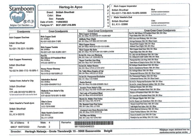 Onze Cruse is geboren uit ons C nestje van mama Suus en papa Chester. Het was liefde op het eerste gezicht toen ze geboren werd. Cruse werd met haar broer en 2 zussen geboren met een keizersnede. Ze was het kitten dat ik na de geboorte als eerste in mijn armen kreeg en dat gelijk mijn hart veroverde. Wat een prachtig speciaal dametje met haar bicolor lilac kleur. Cruse is een pittige dame met een eigen willetje. Een dame die wat meer op haarzelf is en heerlijk kan spelen maar ook als een echt Britje uren liggen slapen in het zonnetje en dan het liefst op haar rug met het buikje omhoog in de meest onhandige houdingen. Ze is dikke vriendinnen met de andere dames in huis.